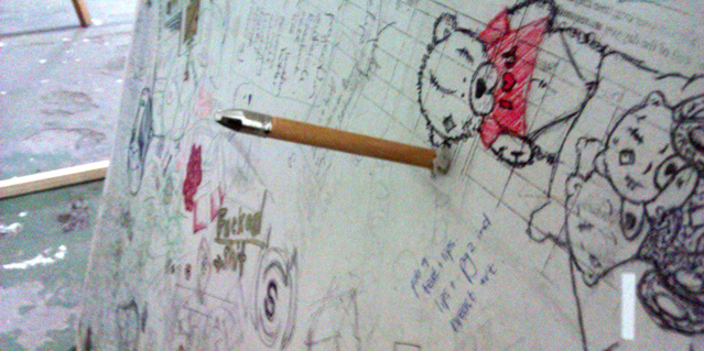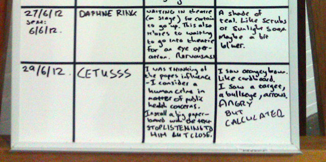 I saw the colour orangey brown sort of like the Mark Rothko (perhaps this could be related to the cardboard? But perhaps I am hoping too much). I saw a target, a circle something with a bullseye, also shooting, arrows. I saw me smashing things inside the space, making a big mess, perhaps with food? It was quite angry but calculated.