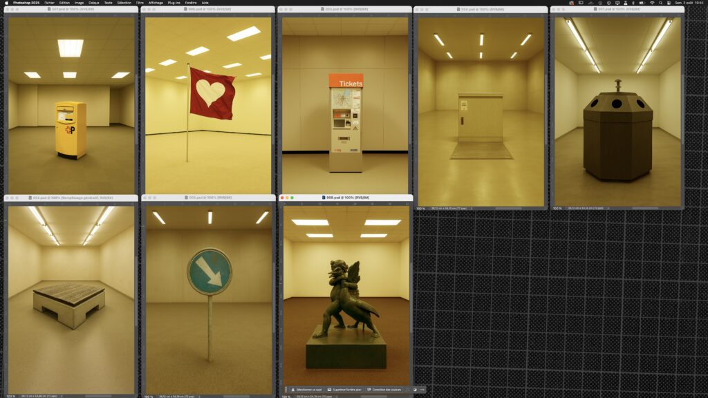 Cette série photographique explore la zone trouble entre le familier et l’étrange. En puisant dans des éléments architecturaux et des objets publics réels trouvés dans la ville de Genève, chaque image transpose ces artefacts urbains dans des espaces liminaux, désertés, inspirés de l’esthétique numérique des «Backrooms».