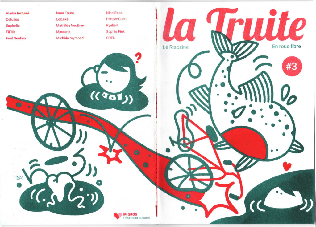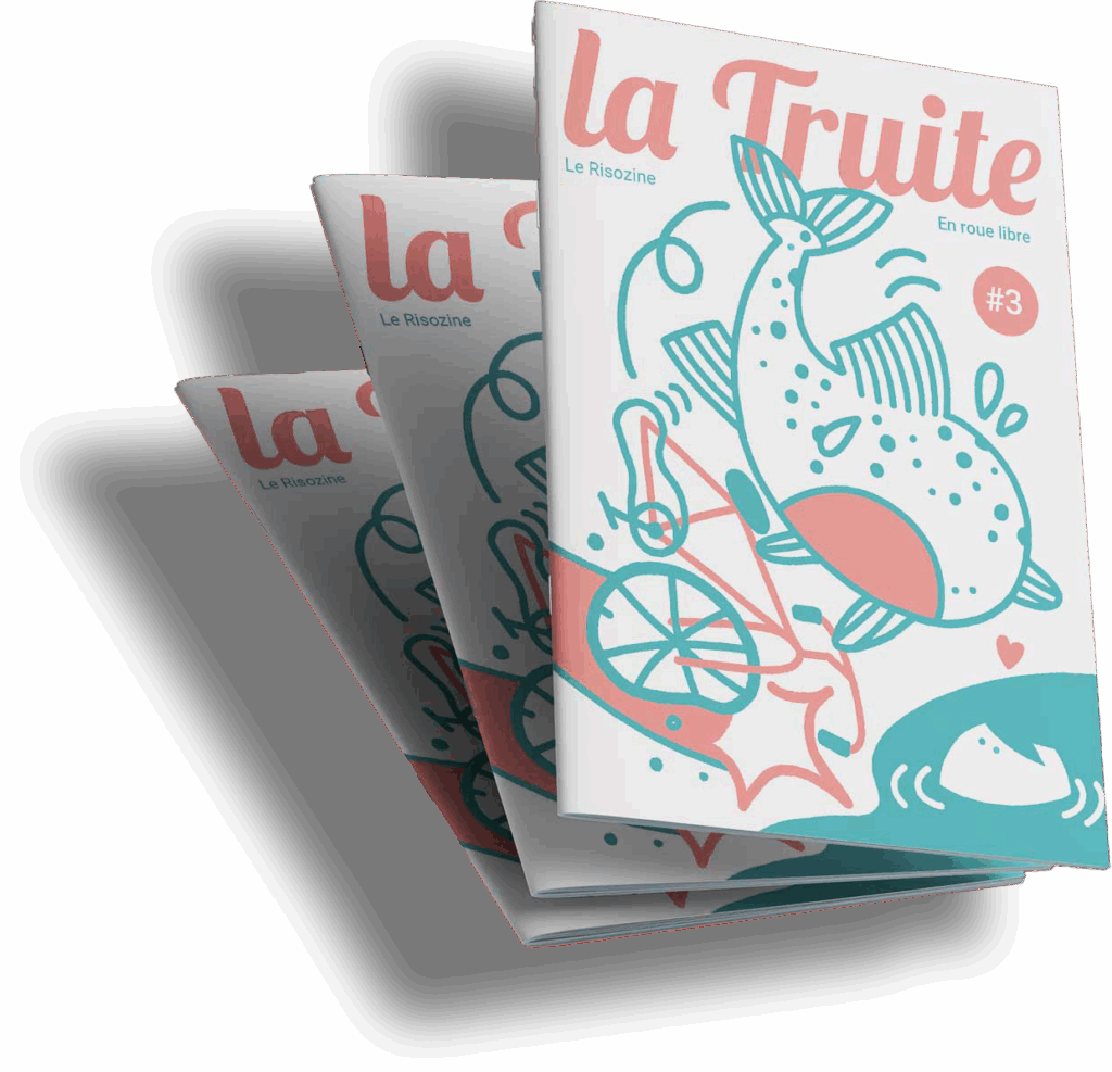 Cette édition du Risozine de Rond Bleu, imprimée en deux couleurs (red et teal), est placée sous le thème « En roue libre ». Tirée à 200 exemplaires, elle met en lumière la créativité d’artistes locaux. Ce Risozine compte 44 pages, imprimées en risographie, une technique écologique encore peu connue. Pour cette édition, Rond Bleu a invité 15 artistes à l’explorer librement, chacun à sa manière.